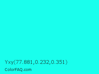 Yxy 77.881,0.232,0.351 Color is a normal cyan color and the nearest color is Loeen #15f2fd. Hex code #19ffed and RGB value is rgb(25,255,237). In RGB color space, this color is composed of 10% red, 100% green, 93% blue, In CMYK color space, this color is composed of 90% cyan, 0% magenta, 7% yellow , 0% black , In HSL color space, this color has a hue angle of 175° , 100% saturation and 55% lightness.