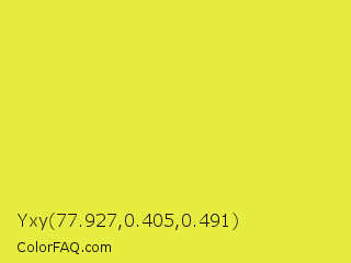 Yxy 77.927,0.405,0.491 Color is a normal yellow color and the nearest color is Starship #ecf245. Hex code #e7ed40 and RGB value is rgb(231,237,64). In RGB color space, this color is composed of 91% red, 93% green, 25% blue, In CMYK color space, this color is composed of 3% cyan, 0% magenta, 73% yellow , 7% black , In HSL color space, this color has a hue angle of 62° , 83% saturation and 59% lightness.