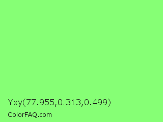 Yxy 77.955,0.313,0.499 Color is a light green color and the nearest color is Light Green #90ee90. Hex code #86ff75 and RGB value is rgb(134,255,117). In RGB color space, this color is composed of 53% red, 100% green, 46% blue, In CMYK color space, this color is composed of 47% cyan, 0% magenta, 54% yellow , 0% black , In HSL color space, this color has a hue angle of 113° , 100% saturation and 73% lightness.