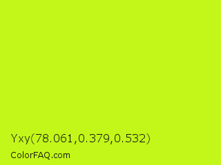 Yxy 78.061,0.379,0.532 Color is a normal lime color and the nearest color is Arctic Lime #d0ff14. Hex code #c2f719 and RGB value is rgb(194,247,25). In RGB color space, this color is composed of 76% red, 97% green, 10% blue, In CMYK color space, this color is composed of 21% cyan, 0% magenta, 90% yellow , 3% black , In HSL color space, this color has a hue angle of 74° , 93% saturation and 53% lightness.