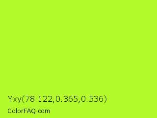 Yxy 78.122,0.365,0.536 Color is a normal green color and the nearest color is Green Yellow #adff2f. Hex code #b3fa2a and RGB value is rgb(179,250,42). In RGB color space, this color is composed of 70% red, 98% green, 16% blue, In CMYK color space, this color is composed of 28% cyan, 0% magenta, 83% yellow , 2% black , In HSL color space, this color has a hue angle of 80° , 95% saturation and 57% lightness.
