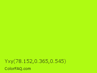 Yxy 78.152,0.365,0.545 Color is a normal green color and the nearest color is Spring Bud #a7fc00. Hex code #affb12 and RGB value is rgb(175,251,18). In RGB color space, this color is composed of 69% red, 98% green, 7% blue, In CMYK color space, this color is composed of 30% cyan, 0% magenta, 93% yellow , 2% black , In HSL color space, this color has a hue angle of 80° , 97% saturation and 53% lightness.