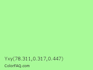 Yxy 78.311,0.317,0.447 Color is a light green color and the nearest color is Pale Green #98fb98. Hex code #a8f997 and RGB value is rgb(168,249,151). In RGB color space, this color is composed of 66% red, 98% green, 59% blue, In CMYK color space, this color is composed of 33% cyan, 0% magenta, 39% yellow , 2% black , In HSL color space, this color has a hue angle of 110° , 89% saturation and 78% lightness.