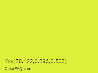 Yxy 78.422,0.396,0.503 Color is a normal yellow color and the nearest color is Starship #ecf245. Hex code #dcf139 and RGB value is rgb(220,241,57). In RGB color space, this color is composed of 86% red, 95% green, 22% blue, In CMYK color space, this color is composed of 9% cyan, 0% magenta, 76% yellow , 5% black , In HSL color space, this color has a hue angle of 67° , 87% saturation and 58% lightness.