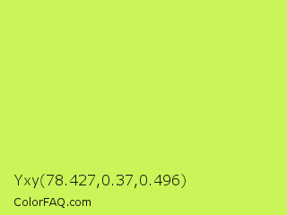 Yxy 78.427,0.37,0.496 Color is a light lime color and the nearest color is Maximum Green Yellow #d9e650. Hex code #c9f558 and RGB value is rgb(201,245,88). In RGB color space, this color is composed of 79% red, 96% green, 35% blue, In CMYK color space, this color is composed of 18% cyan, 0% magenta, 64% yellow , 4% black , In HSL color space, this color has a hue angle of 77° , 89% saturation and 65% lightness.
