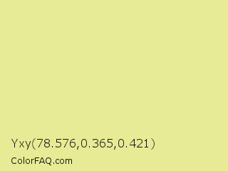 Yxy 78.576,0.365,0.421 Color is a light yellow color and the nearest color is Primrose #edea99. Hex code #e7eb95 and RGB value is rgb(231,235,149). In RGB color space, this color is composed of 91% red, 92% green, 58% blue, In CMYK color space, this color is composed of 2% cyan, 0% magenta, 37% yellow , 8% black , In HSL color space, this color has a hue angle of 63° , 68% saturation and 75% lightness.