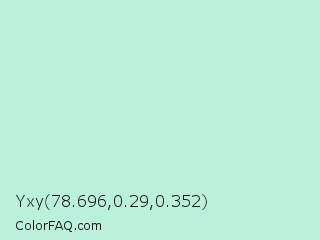 Yxy 78.696,0.29,0.352 Color is a very light green color and the nearest color is Cruise #b5ecdf. Hex code #baf1dd and RGB value is rgb(186,241,221). In RGB color space, this color is composed of 73% red, 95% green, 87% blue, In CMYK color space, this color is composed of 23% cyan, 0% magenta, 8% yellow , 5% black , In HSL color space, this color has a hue angle of 158° , 66% saturation and 84% lightness.