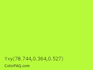 Yxy 78.744,0.364,0.527 Color is a normal green color and the nearest color is Green Yellow #adff2f. Hex code #b7fa3a and RGB value is rgb(183,250,58). In RGB color space, this color is composed of 72% red, 98% green, 23% blue, In CMYK color space, this color is composed of 27% cyan, 0% magenta, 77% yellow , 2% black , In HSL color space, this color has a hue angle of 81° , 95% saturation and 60% lightness.