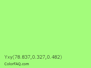 Yxy 78.837,0.327,0.482 Color is a light green color and the nearest color is Pale Green #98fb98. Hex code #a3fc7b and RGB value is rgb(163,252,123). In RGB color space, this color is composed of 64% red, 99% green, 48% blue, In CMYK color space, this color is composed of 35% cyan, 0% magenta, 51% yellow , 1% black , In HSL color space, this color has a hue angle of 101° , 96% saturation and 74% lightness.