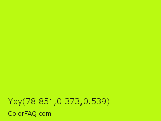 Yxy 78.851,0.373,0.539 Color is a normal lime color and the nearest color is Lime #bfff00. Hex code #bafa11 and RGB value is rgb(186,250,17). In RGB color space, this color is composed of 73% red, 98% green, 7% blue, In CMYK color space, this color is composed of 26% cyan, 0% magenta, 93% yellow , 2% black , In HSL color space, this color has a hue angle of 76° , 96% saturation and 52% lightness.