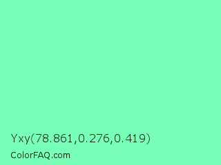 Yxy 78.861,0.276,0.419 Color is a light green color and the nearest color is Aquamarine #7fffd4. Hex code #77ffb7 and RGB value is rgb(119,255,183). In RGB color space, this color is composed of 47% red, 100% green, 72% blue, In CMYK color space, this color is composed of 53% cyan, 0% magenta, 28% yellow , 0% black , In HSL color space, this color has a hue angle of 148° , 100% saturation and 73% lightness.
