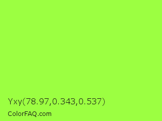Yxy 78.97,0.343,0.537 Color is a light green color and the nearest color is French Lime #9efd38. Hex code #9cff41 and RGB value is rgb(156,255,65). In RGB color space, this color is composed of 61% red, 100% green, 25% blue, In CMYK color space, this color is composed of 39% cyan, 0% magenta, 75% yellow , 0% black , In HSL color space, this color has a hue angle of 91° , 100% saturation and 63% lightness.
