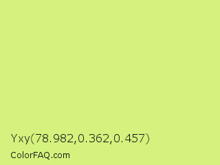Yxy 78.982,0.362,0.457 Color is a light lime color and the nearest color is Sulu #c1f07c. Hex code #d4f27d and RGB value is rgb(212,242,125). In RGB color space, this color is composed of 83% red, 95% green, 49% blue, In CMYK color space, this color is composed of 12% cyan, 0% magenta, 48% yellow , 5% black , In HSL color space, this color has a hue angle of 75° , 82% saturation and 72% lightness.