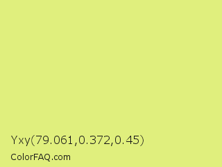 Yxy 79.061,0.372,0.45 Color is a light yellow color and the nearest color is Manz #eeef78. Hex code #e0ef7d and RGB value is rgb(224,239,125). In RGB color space, this color is composed of 88% red, 94% green, 49% blue, In CMYK color space, this color is composed of 6% cyan, 0% magenta, 48% yellow , 6% black , In HSL color space, this color has a hue angle of 68° , 78% saturation and 71% lightness.