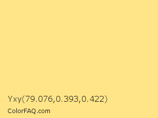 Yxy 79.076,0.393,0.422 Color is a light yellow color and the nearest color is Yellow Crayola #fce883. Hex code #ffe588 and RGB value is rgb(255,229,136). In RGB color space, this color is composed of 100% red, 90% green, 53% blue, In CMYK color space, this color is composed of 0% cyan, 10% magenta, 47% yellow , 0% black , In HSL color space, this color has a hue angle of 47° , 100% saturation and 77% lightness.