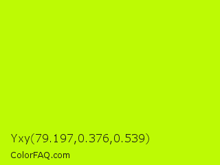 Yxy 79.197,0.376,0.539 Color is a normal lime color and the nearest color is Lime #bfff00. Hex code #bdfa04 and RGB value is rgb(189,250,4). In RGB color space, this color is composed of 74% red, 98% green, 2% blue, In CMYK color space, this color is composed of 24% cyan, 0% magenta, 98% yellow , 2% black , In HSL color space, this color has a hue angle of 75° , 97% saturation and 50% lightness.
