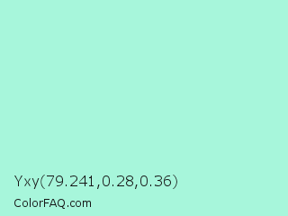 Yxy 79.241,0.28,0.36 Color is a very light green color and the nearest color is Magic Mint #aaf0d1. Hex code #a7f6db and RGB value is rgb(167,246,219). In RGB color space, this color is composed of 65% red, 96% green, 86% blue, In CMYK color space, this color is composed of 32% cyan, 0% magenta, 11% yellow , 4% black , In HSL color space, this color has a hue angle of 159° , 81% saturation and 81% lightness.