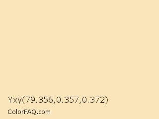 Yxy 79.356,0.357,0.372 Color is a very light orange color and the nearest color is Dairy Cream #f9e4bc. Hex code #fae4ba and RGB value is rgb(250,228,186). In RGB color space, this color is composed of 98% red, 89% green, 73% blue, In CMYK color space, this color is composed of 0% cyan, 9% magenta, 26% yellow , 2% black , In HSL color space, this color has a hue angle of 39° , 86% saturation and 85% lightness.