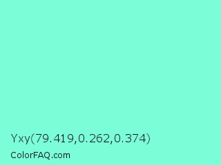 Yxy 79.419,0.262,0.374 Color is a light green color and the nearest color is Aquamarine #7fffd4. Hex code #7bfdd8 and RGB value is rgb(123,253,216). In RGB color space, this color is composed of 48% red, 99% green, 85% blue, In CMYK color space, this color is composed of 51% cyan, 0% magenta, 15% yellow , 1% black , In HSL color space, this color has a hue angle of 163° , 97% saturation and 74% lightness.