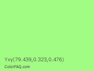 Yxy 79.439,0.323,0.476 Color is a light green color and the nearest color is Mint Green #98ff98. Hex code #a1fd82 and RGB value is rgb(161,253,130). In RGB color space, this color is composed of 63% red, 99% green, 51% blue, In CMYK color space, this color is composed of 36% cyan, 0% magenta, 49% yellow , 1% black , In HSL color space, this color has a hue angle of 105° , 97% saturation and 75% lightness.