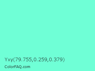 Yxy 79.755,0.259,0.379 Color is a light green color and the nearest color is Aquamarine #7fffd4. Hex code #6fffd6 and RGB value is rgb(111,255,214). In RGB color space, this color is composed of 44% red, 100% green, 84% blue, In CMYK color space, this color is composed of 56% cyan, 0% magenta, 16% yellow , 0% black , In HSL color space, this color has a hue angle of 163° , 100% saturation and 72% lightness.