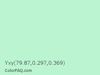 Yxy 79.87,0.297,0.369 Color is a very light green color and the nearest color is Cruise #b5ecdf. Hex code #bbf4d1 and RGB value is rgb(187,244,209). In RGB color space, this color is composed of 73% red, 96% green, 82% blue, In CMYK color space, this color is composed of 23% cyan, 0% magenta, 14% yellow , 4% black , In HSL color space, this color has a hue angle of 143° , 72% saturation and 85% lightness.