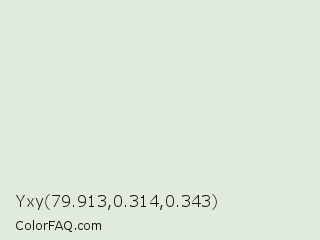 Yxy 79.913,0.314,0.343 Color is a very light green color and the nearest color is Willow Brook #dfecda. Hex code #e0eadd and RGB value is rgb(224,234,221). In RGB color space, this color is composed of 88% red, 92% green, 87% blue, In CMYK color space, this color is composed of 4% cyan, 0% magenta, 6% yellow , 8% black , In HSL color space, this color has a hue angle of 106° , 24% saturation and 89% lightness.