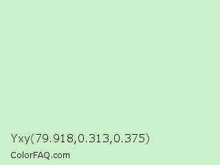 Yxy 79.918,0.313,0.375 Color is a very light green color and the nearest color is Tea Green #d0f0c0. Hex code #ccf1c8 and RGB value is rgb(204,241,200). In RGB color space, this color is composed of 80% red, 95% green, 78% blue, In CMYK color space, this color is composed of 15% cyan, 0% magenta, 17% yellow , 5% black , In HSL color space, this color has a hue angle of 114° , 59% saturation and 86% lightness.