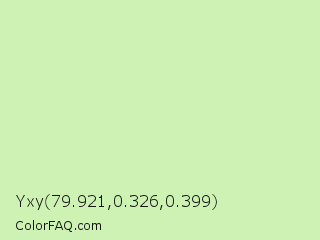 Yxy 79.921,0.326,0.399 Color is a very light green color and the nearest color is Gossip #d2f8b0. Hex code #cdf2b4 and RGB value is rgb(205,242,180). In RGB color space, this color is composed of 80% red, 95% green, 71% blue, In CMYK color space, this color is composed of 15% cyan, 0% magenta, 26% yellow , 5% black , In HSL color space, this color has a hue angle of 96° , 70% saturation and 83% lightness.
