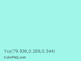 Yxy 79.936,0.269,0.344 Color is a light cyan color and the nearest color is Waterspout #a4f4f9. Hex code #9ff7ea and RGB value is rgb(159,247,234). In RGB color space, this color is composed of 62% red, 97% green, 92% blue, In CMYK color space, this color is composed of 36% cyan, 0% magenta, 5% yellow , 3% black , In HSL color space, this color has a hue angle of 171° , 85% saturation and 80% lightness.