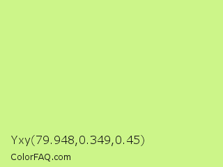 Yxy 79.948,0.349,0.45 Color is a light green color and the nearest color is Sulu #c1f07c. Hex code #ccf589 and RGB value is rgb(204,245,137). In RGB color space, this color is composed of 80% red, 96% green, 54% blue, In CMYK color space, this color is composed of 17% cyan, 0% magenta, 44% yellow , 4% black , In HSL color space, this color has a hue angle of 83° , 84% saturation and 75% lightness.