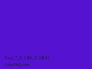 Yxy 7,0.186,0.084 Color is a normal violet color and the nearest color is Interdimensional Blue #360ccc. Hex code #5513d1 and RGB value is rgb(85,19,209). In RGB color space, this color is composed of 33% red, 7% green, 82% blue, In CMYK color space, this color is composed of 59% cyan, 91% magenta, 0% yellow , 18% black , In HSL color space, this color has a hue angle of 261° , 83% saturation and 45% lightness.