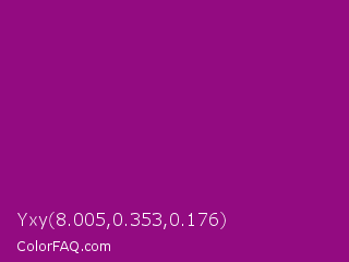 Yxy 8.005,0.353,0.176 Color is a normal magenta color and the nearest color is Mardi Gras #880085. Hex code #930b81 and RGB value is rgb(147,11,129). In RGB color space, this color is composed of 58% red, 4% green, 51% blue, In CMYK color space, this color is composed of 0% cyan, 93% magenta, 12% yellow , 42% black , In HSL color space, this color has a hue angle of 308° , 86% saturation and 31% lightness.