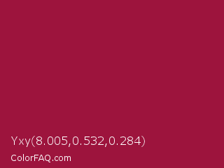 Yxy 8.005,0.532,0.284 Color is a normal rose color and the nearest color is Vivid Burgundy #9f1d35. Hex code #9d143d and RGB value is rgb(157,20,61). In RGB color space, this color is composed of 62% red, 8% green, 24% blue, In CMYK color space, this color is composed of 0% cyan, 87% magenta, 61% yellow , 38% black , In HSL color space, this color has a hue angle of 342° , 77% saturation and 35% lightness.