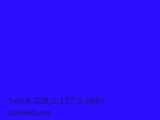Yxy 8.028,0.157,0.066 Color is a normal indigo color and the nearest color is Bluebonnet #1c1cf0. Hex code #2b0ffe and RGB value is rgb(43,15,254). In RGB color space, this color is composed of 17% red, 6% green, 100% blue, In CMYK color space, this color is composed of 83% cyan, 94% magenta, 0% yellow , 0% black , In HSL color space, this color has a hue angle of 247° , 99% saturation and 53% lightness.