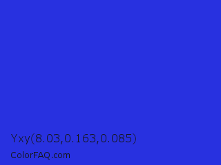 Yxy 8.03,0.163,0.085 Color is a normal blue color and the nearest color is Palatinate Blue #273be2. Hex code #2831e0 and RGB value is rgb(40,49,224). In RGB color space, this color is composed of 16% red, 19% green, 88% blue, In CMYK color space, this color is composed of 82% cyan, 78% magenta, 0% yellow , 12% black , In HSL color space, this color has a hue angle of 237° , 75% saturation and 52% lightness.