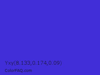 Yxy 8.133,0.174,0.09 Color is a normal indigo color and the nearest color is Palatinate Blue #273be2. Hex code #412ed9 and RGB value is rgb(65,46,217). In RGB color space, this color is composed of 25% red, 18% green, 85% blue, In CMYK color space, this color is composed of 70% cyan, 79% magenta, 0% yellow , 15% black , In HSL color space, this color has a hue angle of 247° , 69% saturation and 52% lightness.