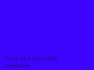 Yxy 8.13,0.162,0.067 Color is a normal indigo color and the nearest color is Electric Ultramarine #3f00ff. Hex code #3c03fd and RGB value is rgb(60,3,253). In RGB color space, this color is composed of 24% red, 1% green, 99% blue, In CMYK color space, this color is composed of 76% cyan, 99% magenta, 0% yellow , 1% black , In HSL color space, this color has a hue angle of 254° , 98% saturation and 50% lightness.