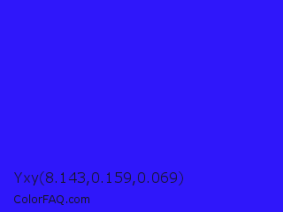 Yxy 8.143,0.159,0.069 Color is a normal indigo color and the nearest color is Bluebonnet #1c1cf0. Hex code #2f17fa and RGB value is rgb(47,23,250). In RGB color space, this color is composed of 18% red, 9% green, 98% blue, In CMYK color space, this color is composed of 81% cyan, 91% magenta, 0% yellow , 2% black , In HSL color space, this color has a hue angle of 246° , 96% saturation and 54% lightness.