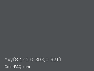 Yxy 8.145,0.303,0.321 Color is a normal blue color and the nearest color is Abbey #4c4f56. Hex code #4e5154 and RGB value is rgb(78,81,84). In RGB color space, this color is composed of 31% red, 32% green, 33% blue, In CMYK color space, this color is composed of 7% cyan, 4% magenta, 0% yellow , 67% black , In HSL color space, this color has a hue angle of 210° , 4% saturation and 32% lightness.
