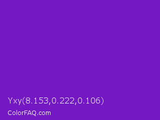 Yxy 8.153,0.222,0.106 Color is a normal purple color and the nearest color is Purple Heart Crayola #652dc1. Hex code #7318c2 and RGB value is rgb(115,24,194). In RGB color space, this color is composed of 45% red, 9% green, 76% blue, In CMYK color space, this color is composed of 41% cyan, 88% magenta, 0% yellow , 24% black , In HSL color space, this color has a hue angle of 272° , 78% saturation and 43% lightness.
