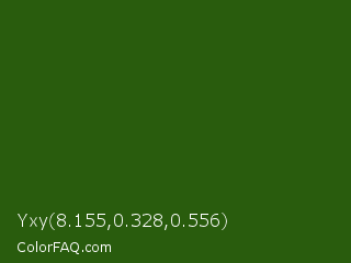 Yxy 8.155,0.328,0.556 Color is a very dark green color and the nearest color is Green House #24500f. Hex code #295c0d and RGB value is rgb(41,92,13). In RGB color space, this color is composed of 16% red, 36% green, 5% blue, In CMYK color space, this color is composed of 55% cyan, 0% magenta, 86% yellow , 64% black , In HSL color space, this color has a hue angle of 99° , 75% saturation and 21% lightness.