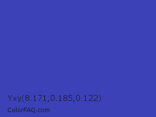 Yxy 8.171,0.185,0.122 Color is a normal blue color and the nearest color is Violet Blue #324ab2. Hex code #3c41b8 and RGB value is rgb(60,65,184). In RGB color space, this color is composed of 24% red, 25% green, 72% blue, In CMYK color space, this color is composed of 67% cyan, 65% magenta, 0% yellow , 28% black , In HSL color space, this color has a hue angle of 238° , 51% saturation and 48% lightness.
