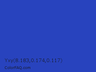 Yxy 8.183,0.174,0.117 Color is a normal blue color and the nearest color is Denim Blue #2243b6. Hex code #2843be and RGB value is rgb(40,67,190). In RGB color space, this color is composed of 16% red, 26% green, 75% blue, In CMYK color space, this color is composed of 79% cyan, 65% magenta, 0% yellow , 25% black , In HSL color space, this color has a hue angle of 229° , 65% saturation and 45% lightness.