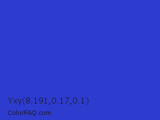 Yxy 8.191,0.17,0.1 Color is a normal blue color and the nearest color is Palatinate Blue #273be2. Hex code #2e3bcf and RGB value is rgb(46,59,207). In RGB color space, this color is composed of 18% red, 23% green, 81% blue, In CMYK color space, this color is composed of 78% cyan, 71% magenta, 0% yellow , 19% black , In HSL color space, this color has a hue angle of 235° , 64% saturation and 50% lightness.