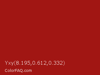 Yxy 8.195,0.612,0.332 Color is a normal red color and the nearest color is Spartan Crimson #9e1316. Hex code #a11613 and RGB value is rgb(161,22,19). In RGB color space, this color is composed of 63% red, 9% green, 7% blue, In CMYK color space, this color is composed of 0% cyan, 86% magenta, 88% yellow , 37% black , In HSL color space, this color has a hue angle of 1° , 79% saturation and 35% lightness.