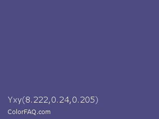Yxy 8.222,0.24,0.205 Color is a normal indigo color and the nearest color is Purple Navy #4e5180. Hex code #4d4b82 and RGB value is rgb(77,75,130). In RGB color space, this color is composed of 30% red, 29% green, 51% blue, In CMYK color space, this color is composed of 41% cyan, 42% magenta, 0% yellow , 49% black , In HSL color space, this color has a hue angle of 242° , 27% saturation and 40% lightness.