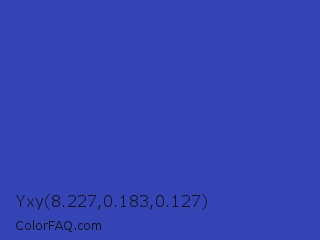 Yxy 8.227,0.183,0.127 Color is a normal blue color and the nearest color is Violet Blue #324ab2. Hex code #3444b5 and RGB value is rgb(52,68,181). In RGB color space, this color is composed of 20% red, 27% green, 71% blue, In CMYK color space, this color is composed of 71% cyan, 62% magenta, 0% yellow , 29% black , In HSL color space, this color has a hue angle of 233° , 55% saturation and 46% lightness.