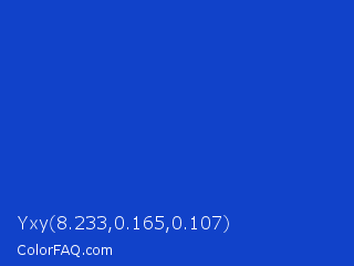 Yxy 8.233,0.165,0.107 Color is a normal blue color and the nearest color is Persian Blue #1c39bb. Hex code #1142c9 and RGB value is rgb(17,66,201). In RGB color space, this color is composed of 7% red, 26% green, 79% blue, In CMYK color space, this color is composed of 92% cyan, 67% magenta, 0% yellow , 21% black , In HSL color space, this color has a hue angle of 224° , 84% saturation and 43% lightness.