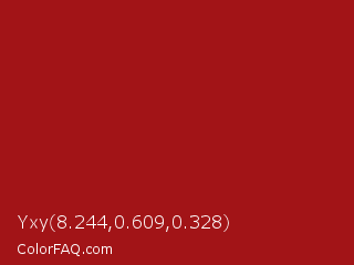 Yxy 8.244,0.609,0.328 Color is a normal red color and the nearest color is Spartan Crimson #9e1316. Hex code #a21417 and RGB value is rgb(162,20,23). In RGB color space, this color is composed of 64% red, 8% green, 9% blue, In CMYK color space, this color is composed of 0% cyan, 88% magenta, 86% yellow , 36% black , In HSL color space, this color has a hue angle of 359° , 78% saturation and 36% lightness.